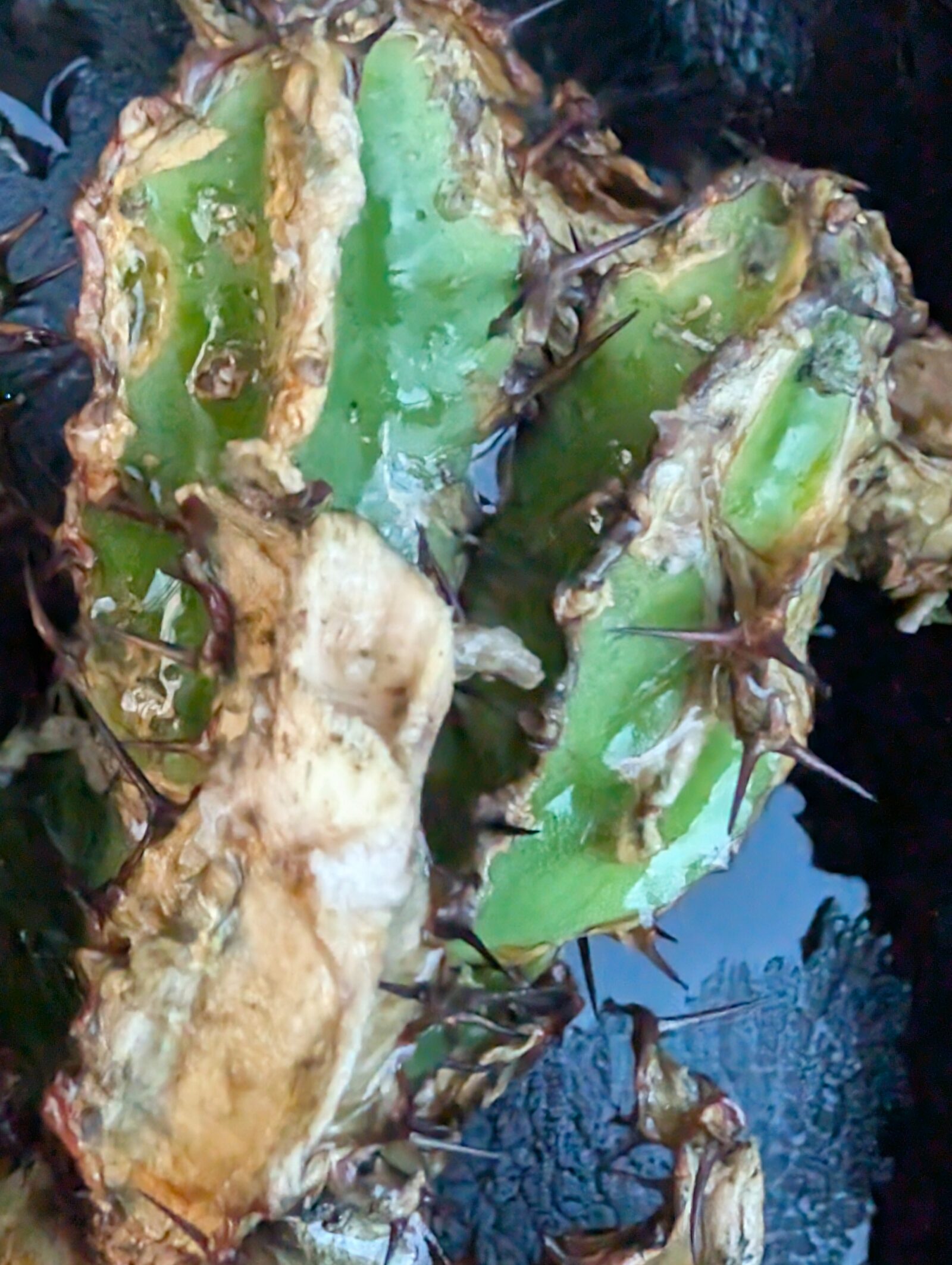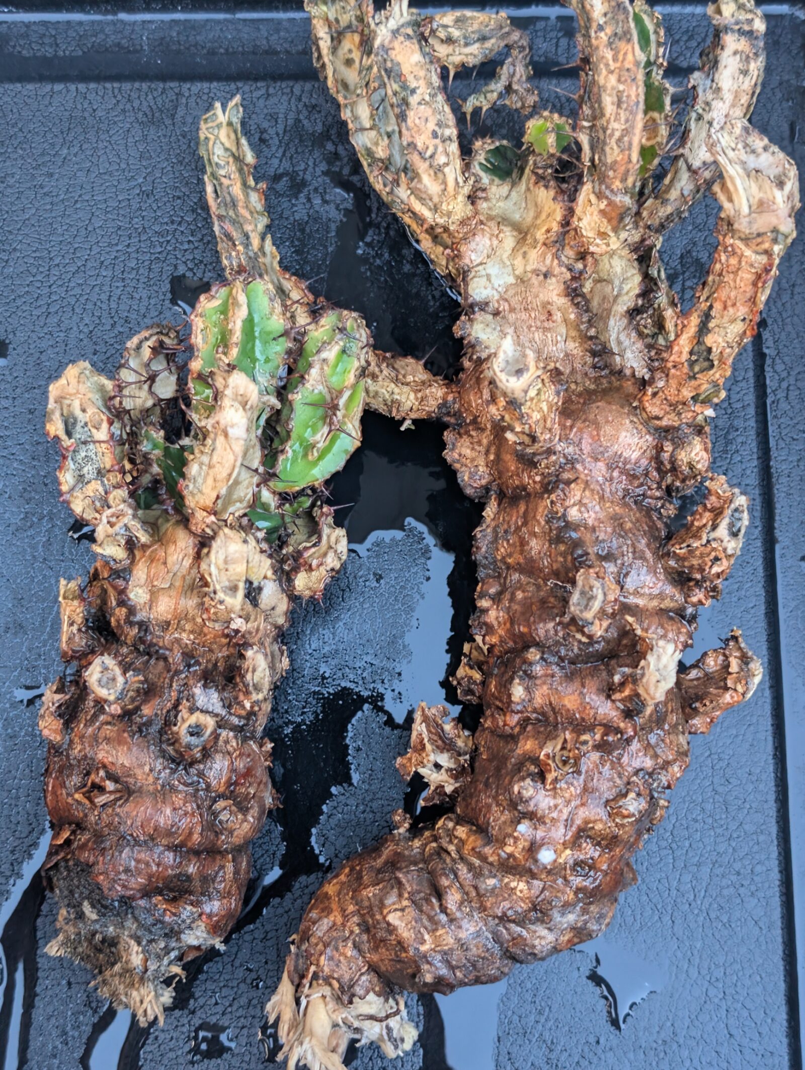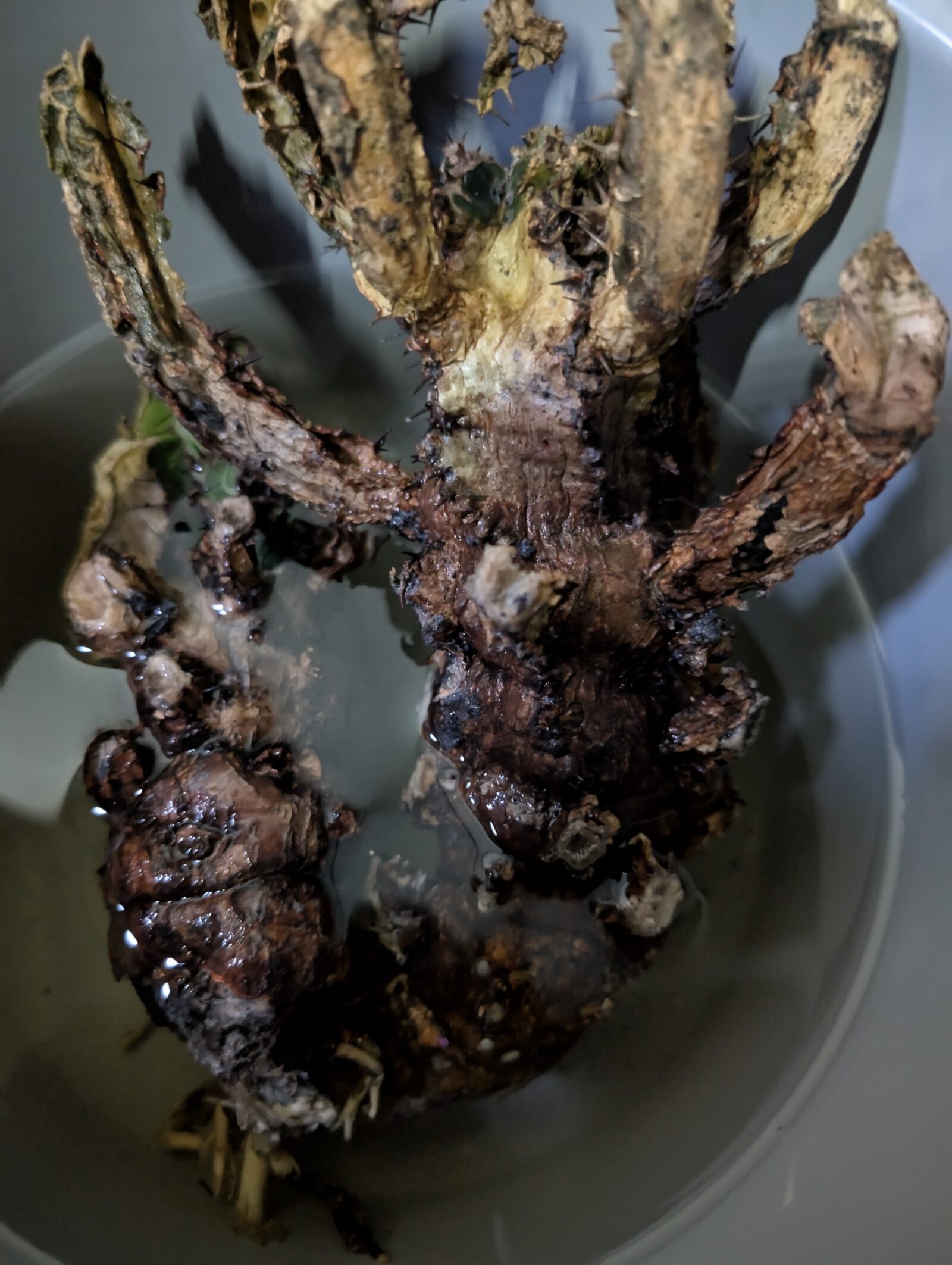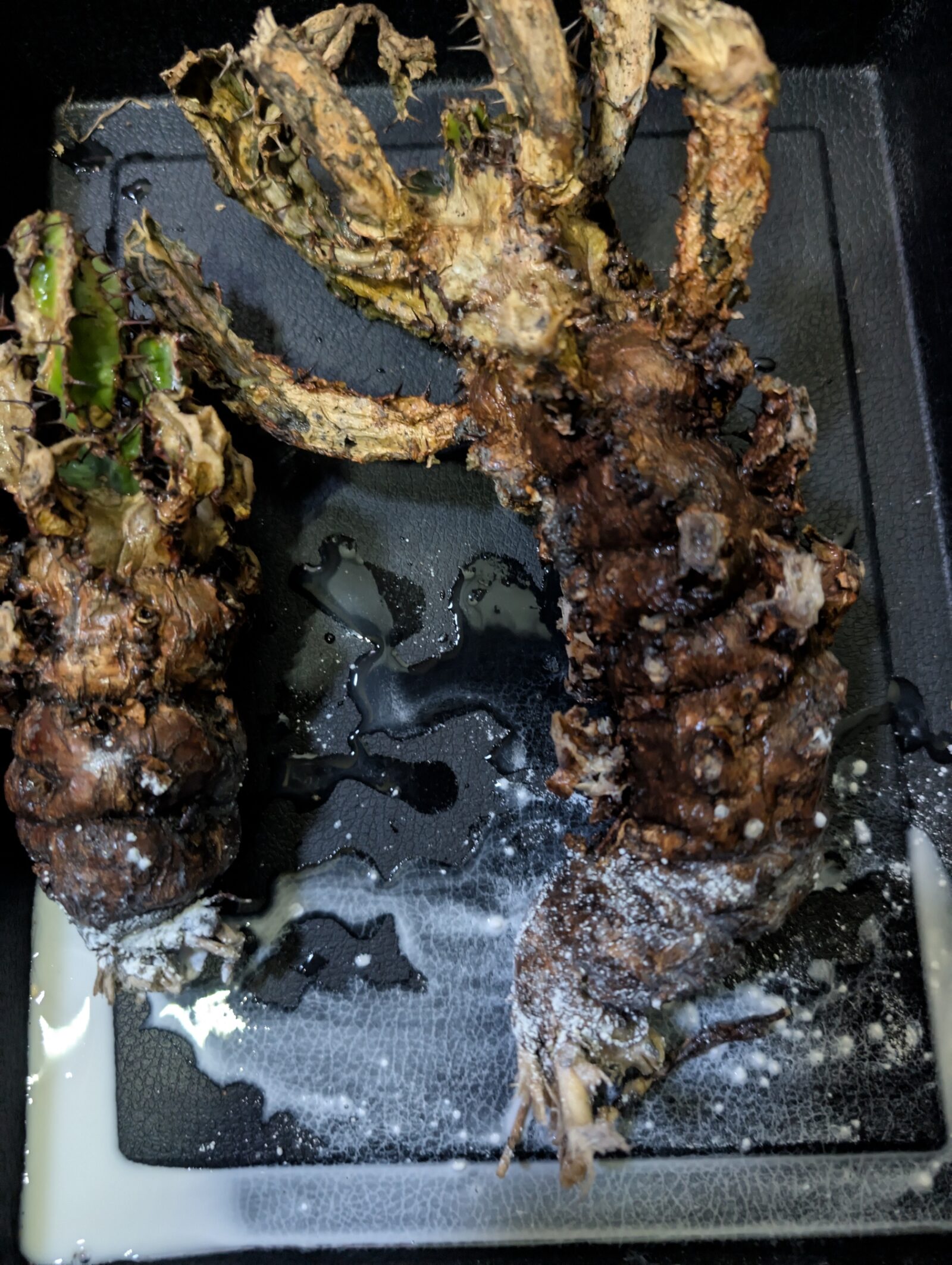 一方で、@ruuplant さんから以前いただいた株は輸入後すぐにオキシベロン処理されているらしく、発根管理しやすいと思います。