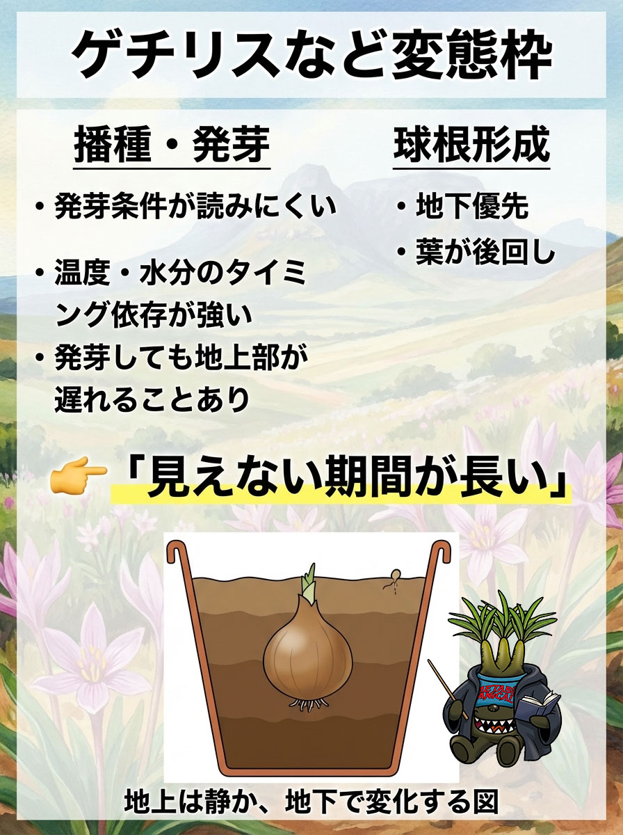 - 播種は秋、低温・乾湿メリハリが鍵