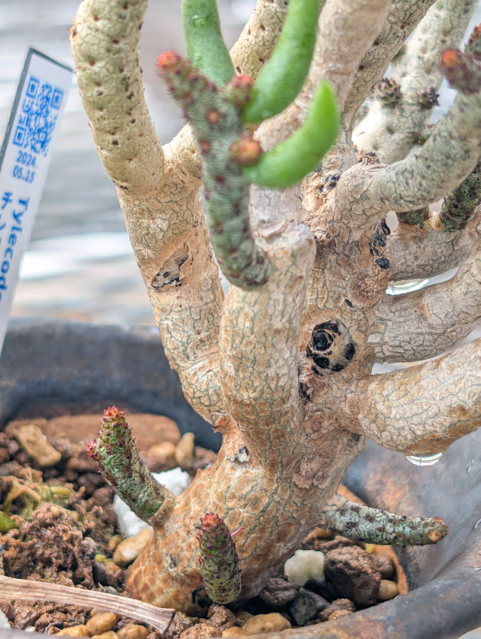 一般に「1年でもほとんど成長しない」みたいに言われがちな種ですが、うちの環境が合っているのか、太い脇芽もしっかり出てきています。